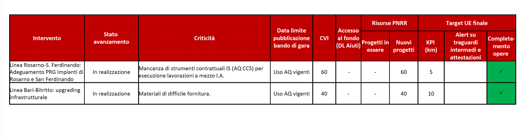 IInoltre, sono previste risorse PNRR pari a circa 3.000 milioni di euro per ulteriori interventi ferroviari multiregionali che coinvolgono anche la regione Puglia.